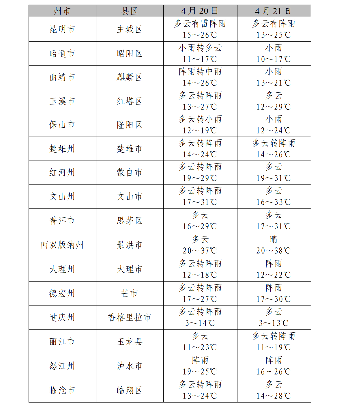 预计4月20日昭通市南部、曲靖市、昆明市东部、文山州东部、怒江州、保山市北部、德宏州北部有小到中雨局部大雨,普洱市西部、西双版纳州局部有阵雨,其他地区有阵雨局部中雨。21日昭通市南部、曲靖市、昆明市东部、文山州东部、迪庆州西部、怒江州有小到中雨局部大雨,昭通市北部、楚雄州北部、丽江市、迪庆州东部、大理州、保山市大部、德宏州大部有阵雨局部中雨,其他地区多云。午后迪庆州东部、丽江市、大理州、楚雄州、昆明市、玉溪市、普洱市南部、红河州北部、曲靖市、昭通市南部有大风。建议加强考务组织、交通疏导和安全管理等工作,并请考生及时收听当地天气预报,注意天气变化,合理安排赴考时间,防范强降雨和强对流天气的不利影响。